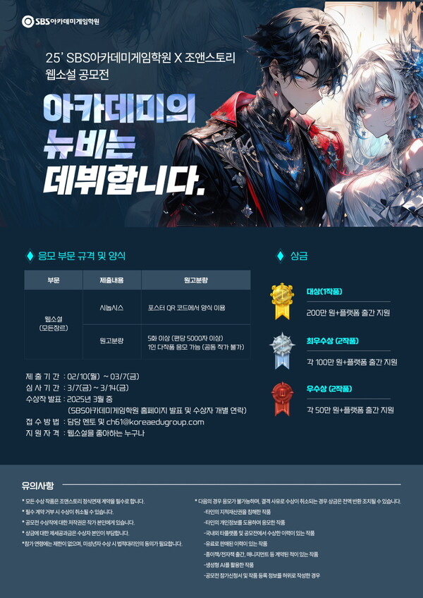 양사는 ‘2025 SBS아카데미게임학원 x 조앤스토리 웹소설 공모전 - 아카데미의 뉴비는 데뷔합니다’를 진행한다.